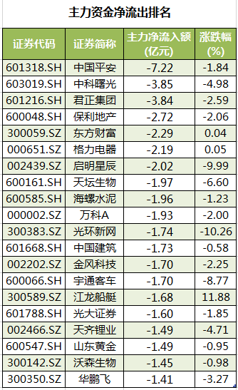 此外,44股被主力资金净卖出超亿元。其中,中国平安、中科曙光、君正集团、保利地产、东方财富主力资金净流出较多,净流出金额分别为7.22亿元、3.85亿元、3.84亿元、2.72亿元、2.29亿元。
