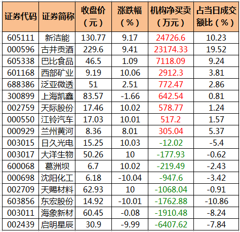 盘后龙虎榜数据显示,机构席位资金净买入4.82亿元,其中,净买入的个股9只,净卖出的个股8只。机构净买入最多的股票是新洁能,净买入金额为2.47亿元;机构净卖出最多的股票是启明星辰,净卖出金额6407.62万元。