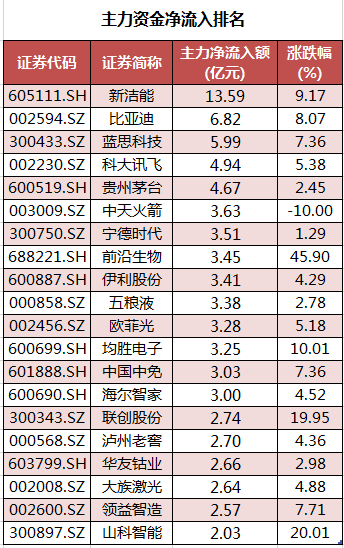 具体到个股来看,58股主力资金净流入超亿元。其中,新洁能、比亚迪、蓝思科技、科大讯飞、贵州茅台主力资金净流入居前,净流入金额分别为13.59亿元、6.82亿元、5.99亿元、4.94亿元、4.67亿元。