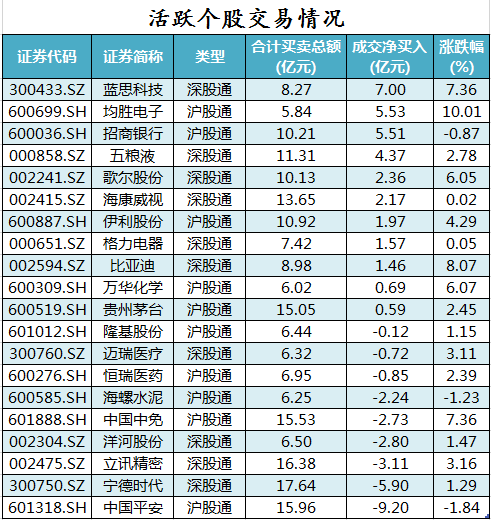 活跃个股方面,蓝思科技、均胜电子、招商银行、五粮液、歌尔股份北向资金净买入较多,净买入金额分别为7亿元、5.53亿元、5.51亿元、4.37亿元、2.36亿元;中国平安、宁德时代、立讯精密、洋河股份、中国中免北向资金净卖出较多,净卖出金额分别为9.2亿元、5.9亿元、3.11亿元、2.8亿元、2.73亿元。