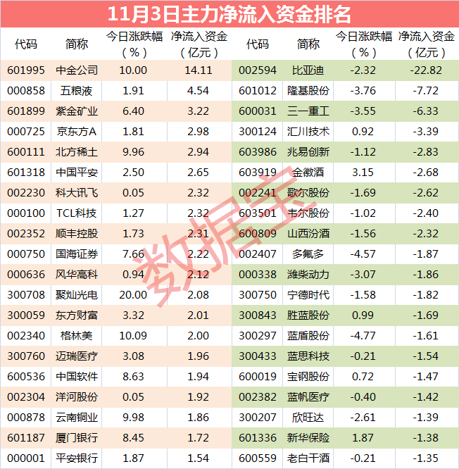 主力资金净流出个股中,比亚迪主力资金净流出22.82亿元,净流出资金最多;其次是光伏龙头隆基股份、三一重工,净流出资金分别为7.72亿元、6.33亿元。