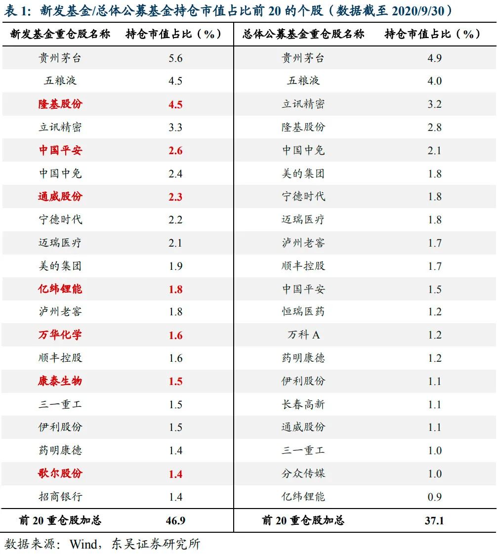 整体来看,新发基金持股集中度更高。新发基金持有的前20重仓股占基金资产净值比例 46.9%,相对于总体公募的37.1%大幅提升。