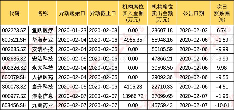 2月3日至7日,两市有8只个股的龙虎榜中出现超过2亿元的机构席位卖出,其中7只发生于2月6日与2月7日两天。