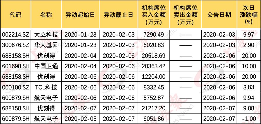 除优刻得外,上周龙虎榜获机构席位大举买入的个股还有大立科技、华大基因、中国卫通、TCL科技、航天电子等,这些个股上周股价多数收获较大涨幅。