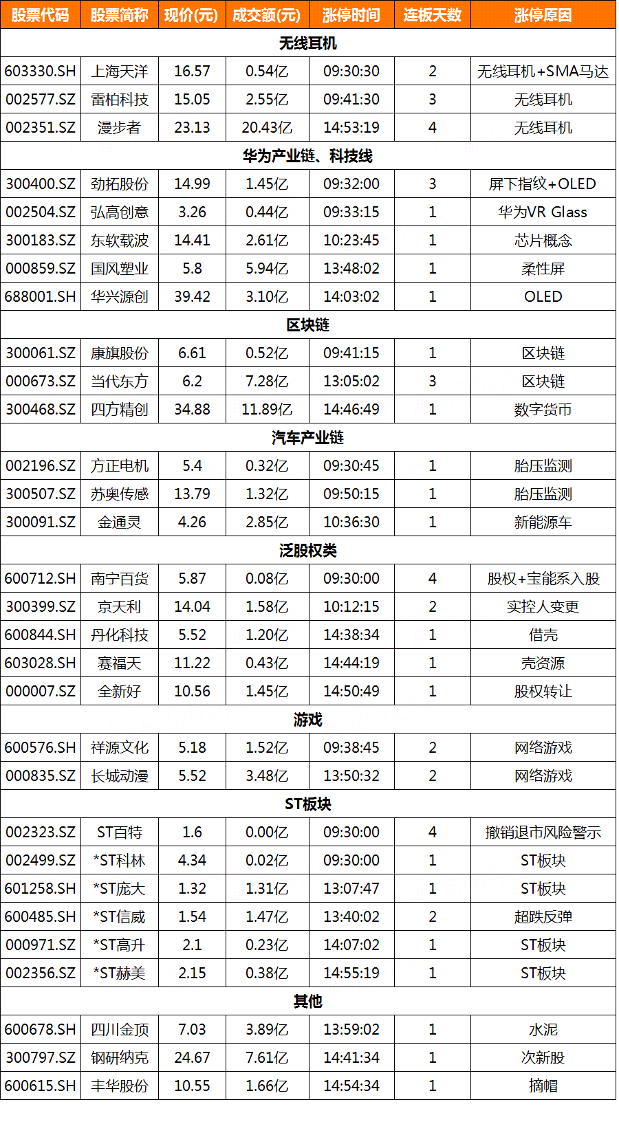 盘面上,三星或推出GalaxyBud+无线耳机,带动无线耳机板块再度走强,共达电声(002655)、漫步者、雷柏科技(002577)、奋达科技(002681)集体涨停;网游及手游板块现涨停潮,盛天网络(300494)、祥源文化(600576)、长城动漫(000835)、鼎龙文化(002502)、慈文传媒(002343)等多股涨停;白酒概念持续拉升,古井贡酒(000596)涨逾7%,金徽酒(603919)、贵州茅台(600519)等涨3%;半导体板块活跃,超华科技(002288)早盘封板,北京君正(300223)尾盘涨停;港口航运板块尾盘异动拉升,招商轮船(601872)直线涨停,中远海能(600026)涨8%。