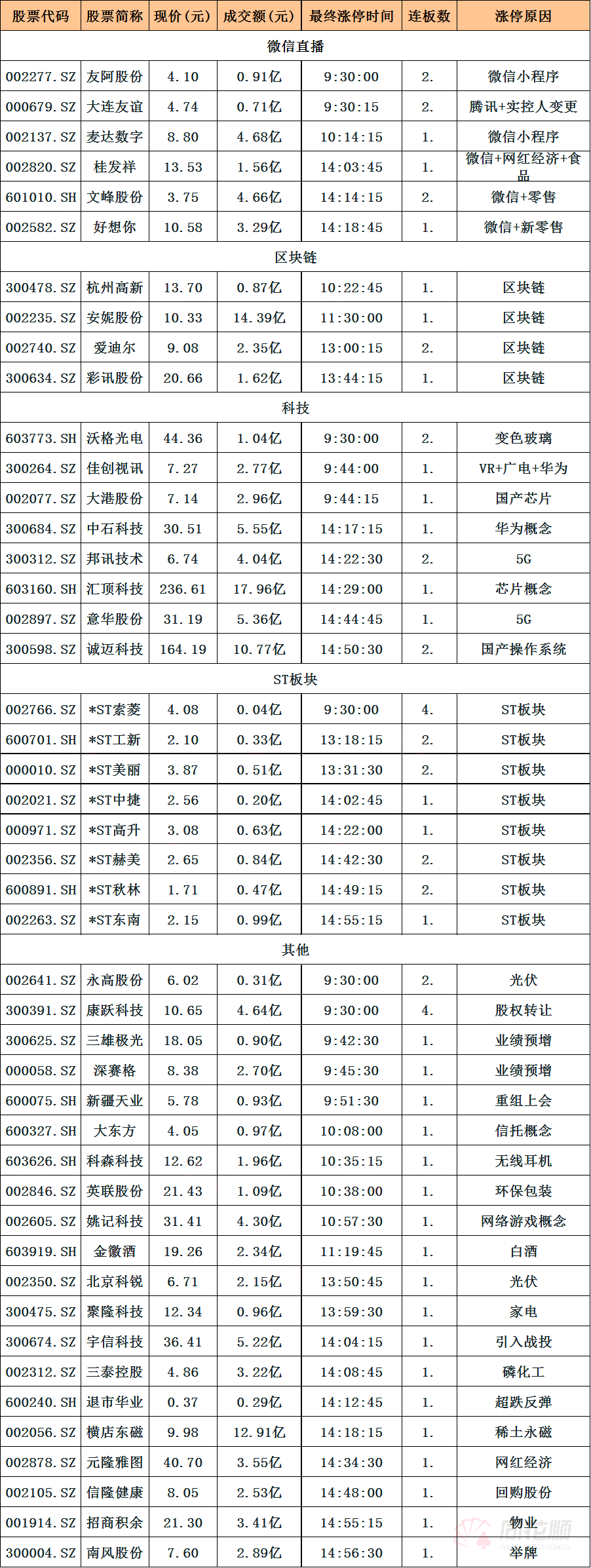 涨停复盘:科技股持续回暖 微信直播概念新鲜上市