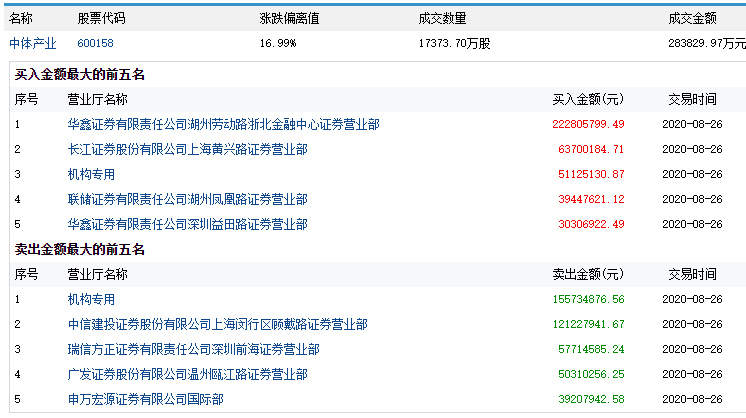 龙虎榜:劳动路大买2.2亿中体产业被砸