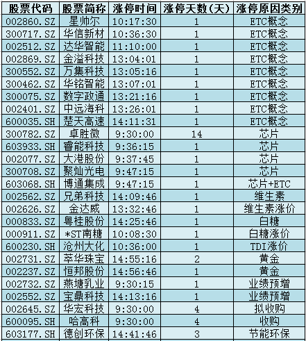 1.ETC概念:交通运输部大力推广ETC,星帅尔、华信新材、达华智能、金溢科技、万集科技、华铭智能、数字政通、中远海科、楚天高速等个股涨停。