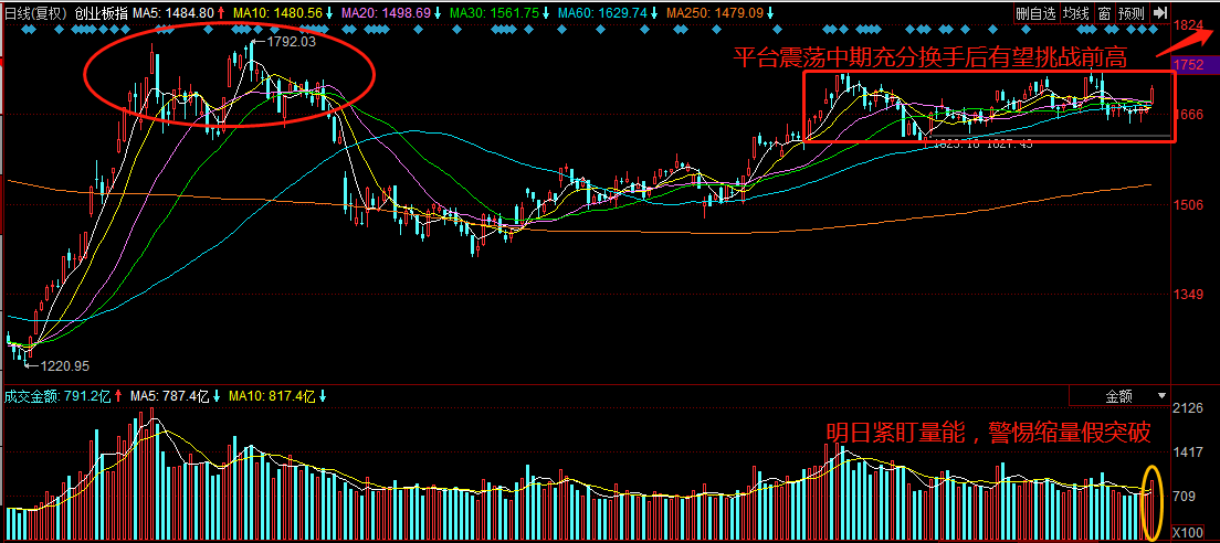 后市策略:昨日的大势猜想中明确判断了今日已无再震荡的空间了,将面临方向选择,并且趋势偏多,今日市场的大涨应该让所有股友们为之一振。短期指数已呈多头趋势,创业板指走势最强,当前的判断,创业板仍在构建中期盘整平台,待充分换手后将挑战1792点新高,一旦有效突破,市场人气将井喷。但从短期看,创业板大阳线后再次临近盘整上沿,明日需紧盯量能,若缩量严重,或高位放量杀跌,需警惕11月20日的假突破,投资者损失惨重。另外,尾盘部分科技股的快速跳水也需要引起重视。