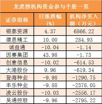 盘后龙虎榜数据显示,机构现身10股,其中银泰资源等2股呈现机构资金净买入,吴通控股等8股则出现机构资金净卖出。