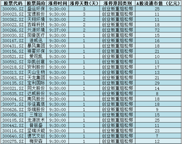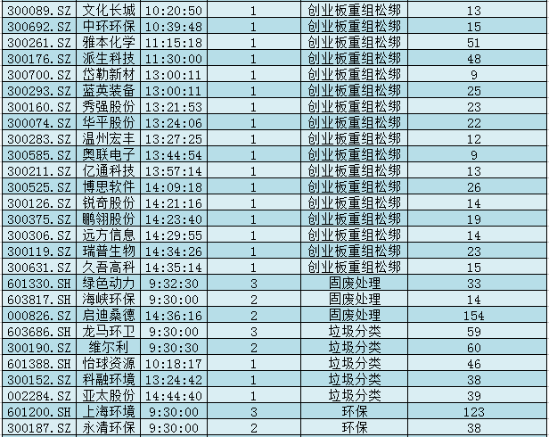 1.创业板壳:创业板借壳有望解禁,盛运环保(叠加环保)、天翔环境(叠加环保)、兴源环境(叠加环保)、宝德股份、吉峰科技、阳普医疗等超过70只低市值创业板壳资源个股上演涨停潮。