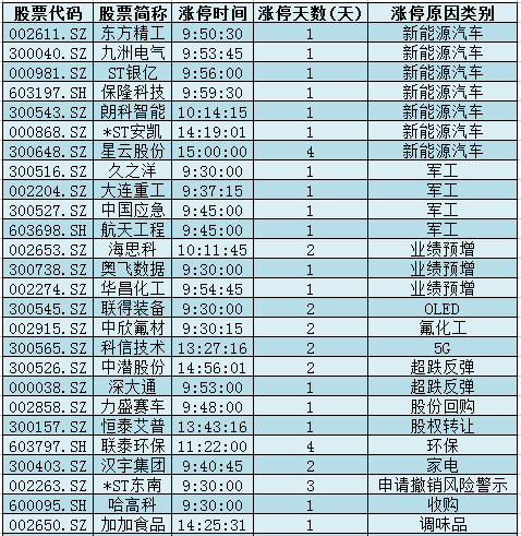 1.新能源汽车:习近平主席向新能源汽车大会致贺信,东方精工、九洲电气、保隆科技、朗科智能、星云股份等个股涨停。