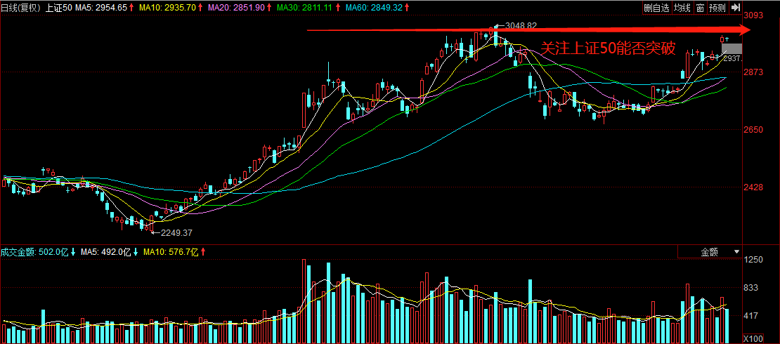 对于今天的走势,大涨之后调整,普涨之后分化,没什么可意外的,大盘的人气、上涨的持续性显然还没有达到2014、2015年大牛市的盛况。指数上需要关注上证50指数还有A50期指(提前量),目前上证50指数走势最强,早已回补完跳空缺口,并且面临前期高点突破只差临门一脚,如果上证50指数能形成突破,对其他指数形成示范效应。顺着这条思路,板块关注的重点就在证券、银行、保险等大金融权重板块,突破向上无法脱离大金融板块的助力。