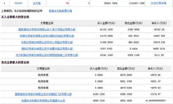 除了上市首日光环以外,其龙虎榜榜单也十分有看点。数据显示,3机构合计卖出1.66亿,章盟主狂买4亿金龙鱼,另一顶级游资也买入1.3亿,明日抛压估计较大。
