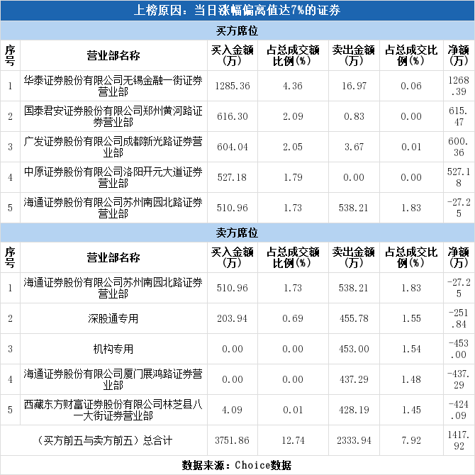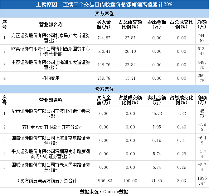 龙虎榜数据显示,今日买四为机构席位,该席位净买入259.78万元,占龙虎榜净买额的13.71%。