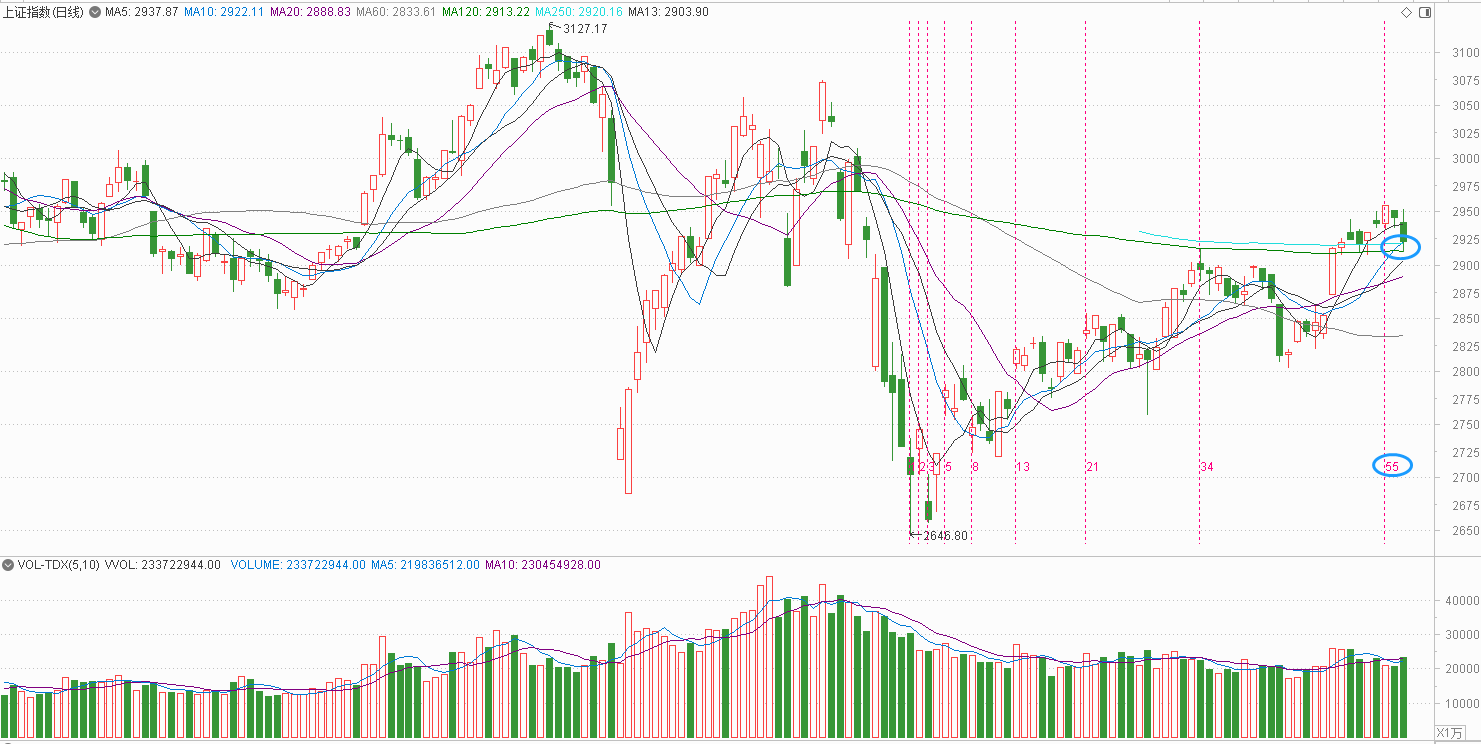 1)周期理论来看,周二时,沪指就已经处于自2646前低反弹以来的第55个交易日,在这个周期,是斐波那契数列的经典变盘窗口。