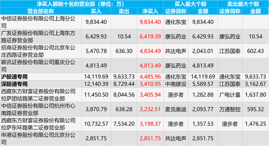 值得一提的是,在净买入排名前十的席位中,有沪股通和深股通的席位,净买入总额为7896.91万元,买入金额最大的是通化东宝、中南建设,所对应的买入金额为14119.69万元、5589.57万元。