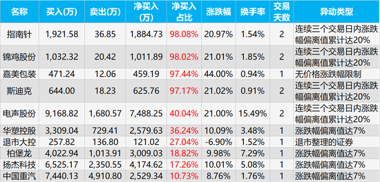 龙虎榜净买入占比最高的三只股票是指南针(23.360, 2.12, 9.98%)、锦鸡股份(14.110, 1.28, 9.98%)、嘉美包装(5.280, 1.61, 43.87%),净买入金额为1884.73万元、1011.89万元、459.19万元,净买入占比分别为98.08%、98.02%、97.44%。
