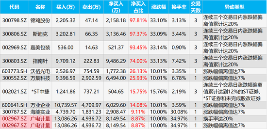 龙虎榜净买入占比最高的三只股票是锦鸡股份、斯迪克、嘉美包装,净买入金额为2158.18万元、3136.46万元、521.37万元,净买入占比分别为97.81%、97.37%、93.45%。