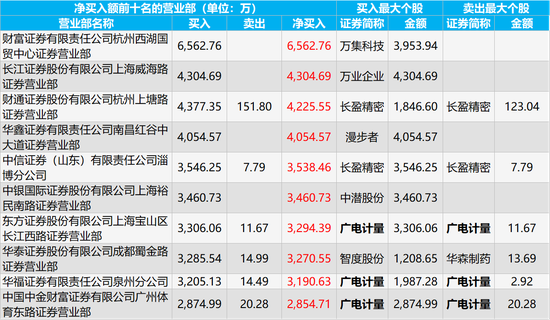 龙虎榜净买入金额前三的营业部是财富证券杭州西湖国贸中心证券营业部、长江证券上海威海路证券营业部、财通证券杭州上塘路证券营业部,净买入金额分别为6562.76万元、4304.69万元、4225.55万元,买入金额最大的个股分别为万集科技、万业企业、长盈精密,所对应的买入金额分别为3953.94万元、4304.69万元、1846.6万元。