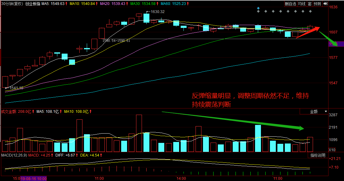 对于大盘指数,我们近期的分析主要以创业板指数为主,科技股为主的创业板是本轮反弹的先锋军,另外主板方面主要跟踪以券商股为主的大金融板块即可。从日K线看,今天已经是创业板前期震荡套牢区兵临城下第3日的调整,只是从量能看市场分歧依旧比较大,有些经验的股友们一定清楚,上涨适当放量,调整不断缩量,甚至地量是较好的一种量价配合关系。从短线30分钟K线图看,尾盘的拉升缺乏量能,且调整周期依然不足,在晚上没有较大利好的情况下,维持指数继续震荡调整的判断。