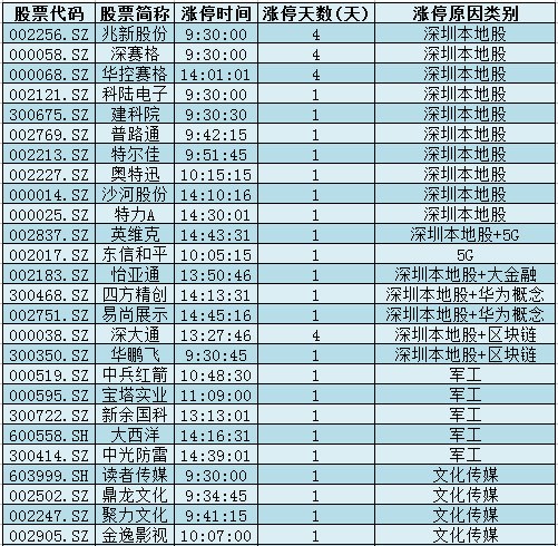 1.深圳本地股:中央支持深圳建设先行示范区,兆新股份(4板)、深赛格(4板)、华控赛格(4板)、科陆电子、建科院等个股涨停。