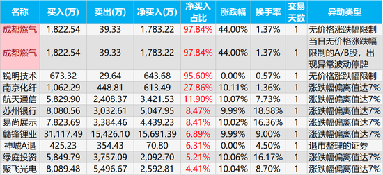 龙虎榜净买入占比最高的三只股票是成都燃气、锐明技术、南京化纤,净买入金额为1783.22万元、643.68万元、613.49万元,净买入占比分别为97.84%、95.60%、27.86%。