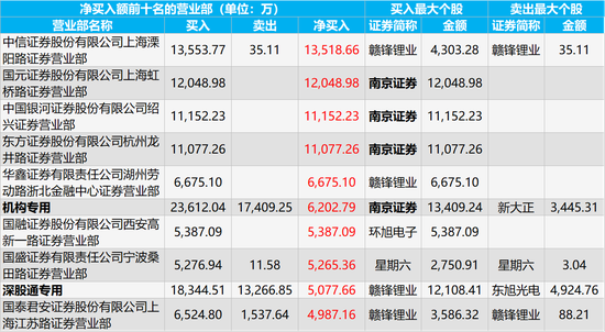 值得一提的是,在净买入排名前十的席位中有机构席位和北向资金的席位。其中,机构买入金额最大的股票是南京证券,买入金额为1.34亿元;北向资金买入金额最大的股票是赣锋锂业,买入金额为1.21亿元。