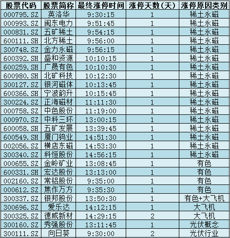 1.稀土永磁:缅甸进口将全面受限稀土价格有望上涨,英洛华、五矿稀土、北方稀土、盛和资源、广晟有色、宁波韵升等个股涨停