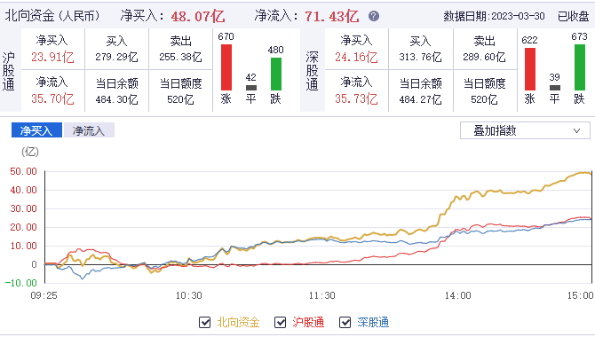 盘面上,酒店旅游、厨卫家电、猪肉、煤炭等板块涨幅居前,国资云、ChatGPT、东数西算、数据要素等板块跌幅居前。同时,沪深两市总成交额9446亿,较上个交易日缩量365亿。而北上资金,则单日净买入48.07亿,流入幅度继续加大。
