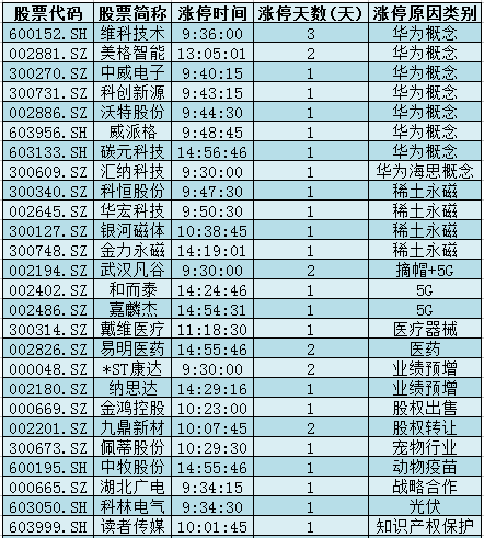 1.华为概念+5G:华为首款5G手机预约量破100万,维科技术、美格智能、中威电子、科创新源、沃特股份、威派格、碳元科技、武汉凡谷、和而泰、嘉麟杰涨停。