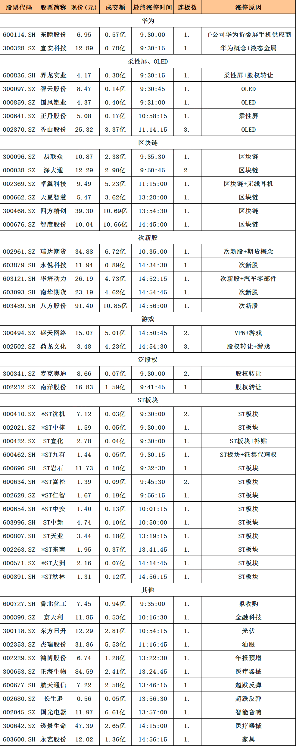 上证指数缩量站上5日线,早盘金融股拉抬,午后指数震荡为主。华为mate X事件促发短线题材OLED日内高潮,区块链、无线耳机、近端次新都有修复,近期火热的股权转让炒作退朝,宝鼎科技跌停。指数可能继续震荡偏多为主,明日短线情绪会继续上升。