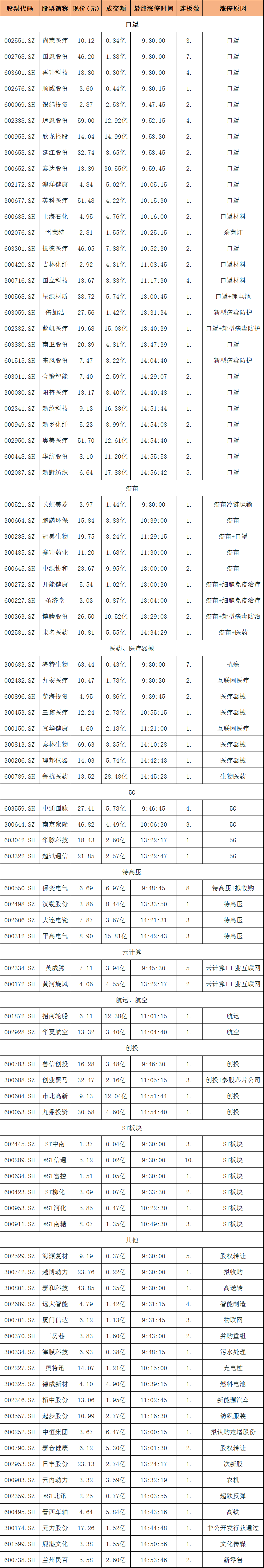 盘面上看,受国内、国际疫情影响,口罩板块依旧表现强势,国恩股份七连板,另有欣龙控股、冠昊生物、阳普医疗、蓝矾医疗等近15支个股涨停。特高压延续上周表现,大连电磁、保变电气、平高电气连板,汉缆股份涨停,汇金通、安靠智电、中国西电等跟涨。午后由于消息面影响,细胞免疫治疗、草地贪夜蛾防治、互联网彩票、超级真菌板块都有拉升表现,其中超级真菌板块泰合健康、海王生物、鲁抗医药、未名医药涨停。前期表现活跃的云办公、无线耳机、集成电路、半导体等板块全天表现疲软,跌幅居前。