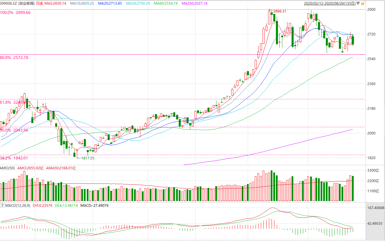 创业板指数来看,今天同样出现了回调,并且是一根放量的实体阴线,日线级别出现了顶分型结构,但短期威力不大,下方极限支撑位在60日均线和黄金分割0.809分位,而短期则看2605这个位置,这点大家适当注意下。