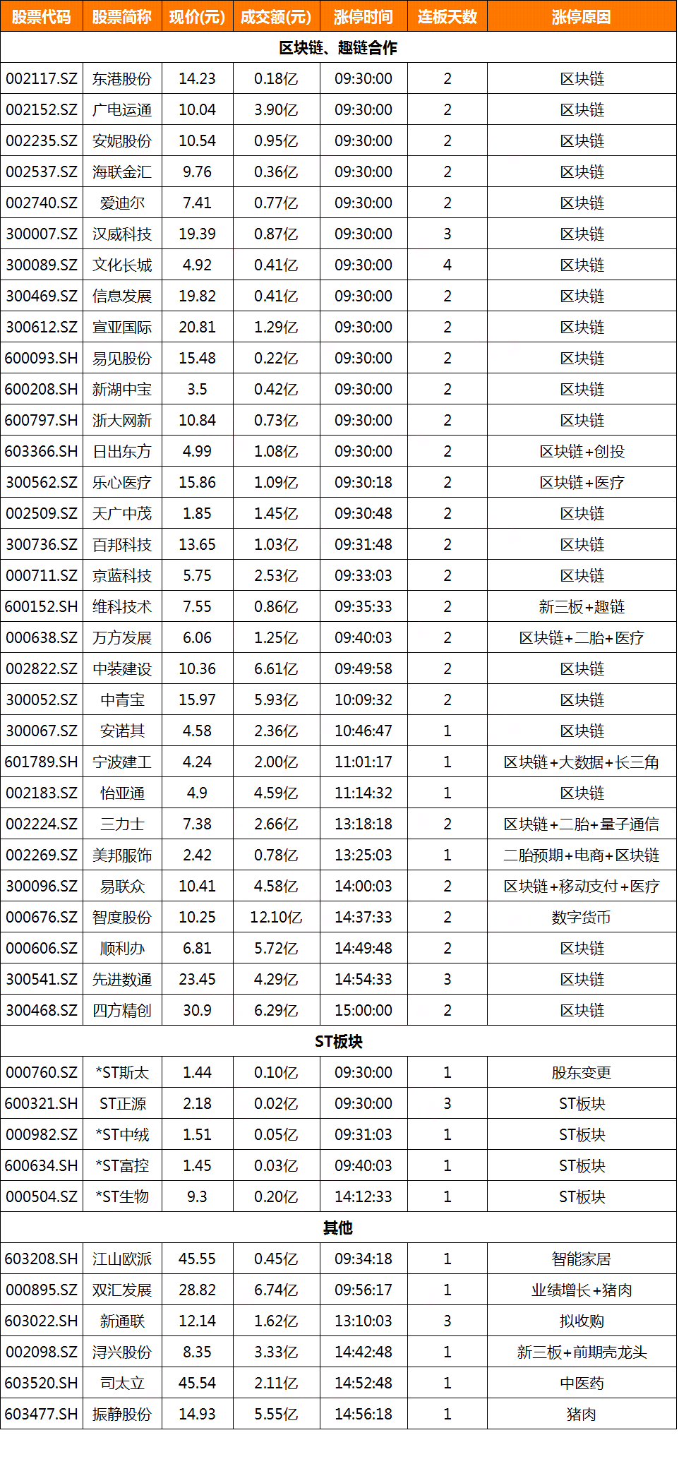 盘面上看,猪肉、养鸡等养殖股全天持续走强,双汇发展(000895)封板,午后振静股份(603477)涨停,益生股份(002458)触板;农业种植板块午后走强,万向德农(600371)触板,敦煌种业(600354)一度涨8%;区块链概念股整体震荡走弱,分化较为明显,久其软件(002279)等多股反抽,尾盘多股炸板;白云机场(600004)净利同比下降,开盘后快速跌停,带动机场航运板块走弱,上海机场(600009)、深圳机场(000089)等跟跌;半导体、5G等科技股走弱,博通集成(603068)、博敏电子(603936)等跌停。