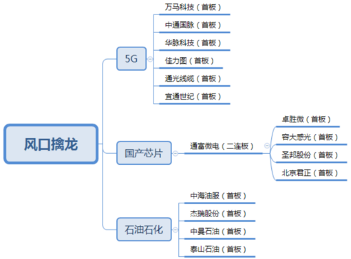 盘面上,今日风口板块:5G、国产芯片以及石油石化。