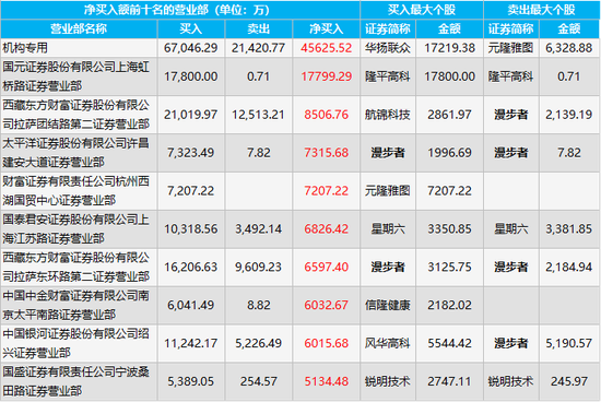 龙虎榜净买入金额前三的营业部是机构专用、国元证券上海虹桥路证券营业部、东方财富拉萨团结路第二证券营业部,净买入金额分别为4.56亿元、1.78亿元、8506.76万元,买入金额最大的个股分别为华扬联众、隆平高科、航锦科技,所对应的买入金额分别为1.72亿元、1.78亿元、2861.97万元。