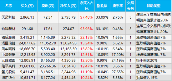 龙虎榜净买入占比最高的三只股票是天迈科技、铂科新材、福成股份,净买入金额为2793.79万元、274.07万元、2273.32万元,净买入占比分别为97.48%、93.96%、22.15%。