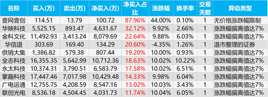 龙虎榜净买入占比最高的三只股票是壹网壹创、华映科技、金科文化,净买入金额为100.72万元、4631.67万元、8079.69万元,净买入占比分别为87.96%、32.12%、22.64%。