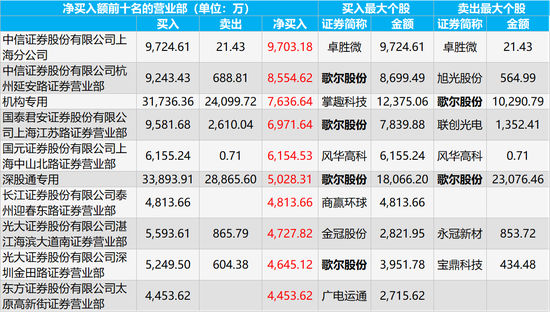 龙虎榜净买入金额前三的营业部是中信证券上海分公司、中信证券杭州延安路证券营业部、机构专用,净买入金额分别为9703.18万元、8554.62万元、7636.64万元,买入金额最大的个股分别是卓胜微、歌尔股份、掌趣科技,所对应的买入金额分别为9724.61万元、8699.49万元、12375.06万元。