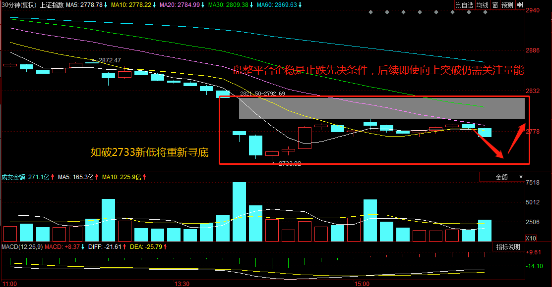 第一,指数何时止跌。从上证指数看,在昨日指数单针探底后形成了构筑底部的机会,但底部不是一日炼成的,形成指数的先决条件是最近三天不能跌破2733点创新低,在此之上涨跌形成震荡,之后再看反弹是强是弱,弱反弹将形成下跌中枢,继续下探低点。具体短线上可以追踪上证指数30分钟K线图,以及量价关系。(见下图)
