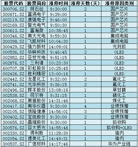 1.国产芯片:上海智能制造文件印发,芯片光刻机为主攻方向,阿石创、富满电子、康强电子、智光电气、富瀚微、南大光电、飞凯材料涨停。