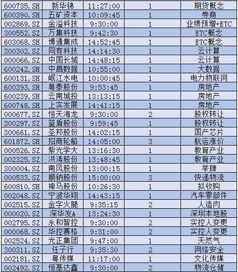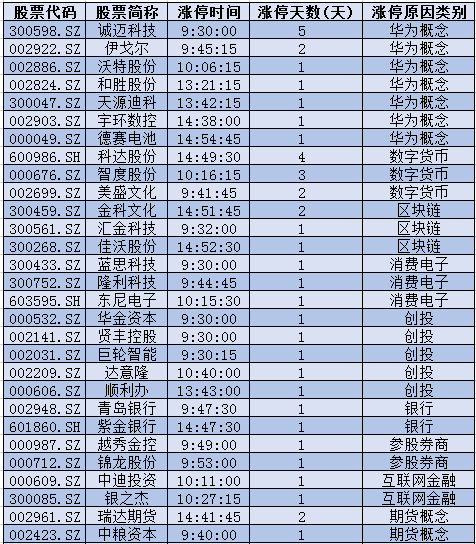 3、数字货币:央行表态令数字货币概念受市场关注,科达股份(3板)、聚龙股份(2板)、智度股份(2板)、美盛文化、金科文化涨停。