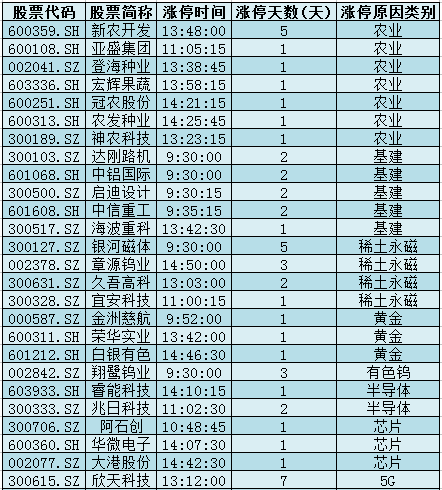 2.农业:贸易摩擦影响持续利好农业类股,新农开发、亚盛集团、登海种业、宏辉果蔬、冠农股份、农发种业等个股涨停。