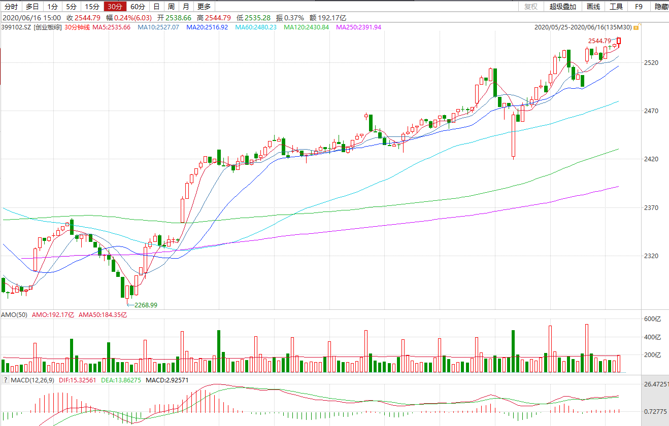 创业板来看,今日再次创出新高,走势越来越像美股的纳斯达克指数,很明显的,创业板指的走势比大盘要强势不少的,但30分钟级别上,今天新高位置MACD红柱子没有继续放长,所以,短期还是不要追高。