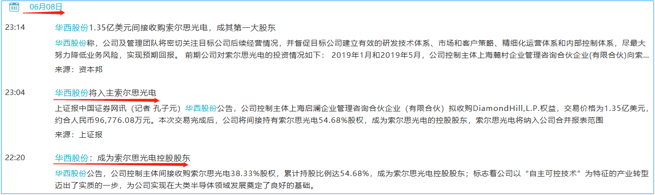 洗盘细节1:6月8日晚间华西股份公布收购外国芯片公司索尔思光电54.68%股权,拿到控股股权。