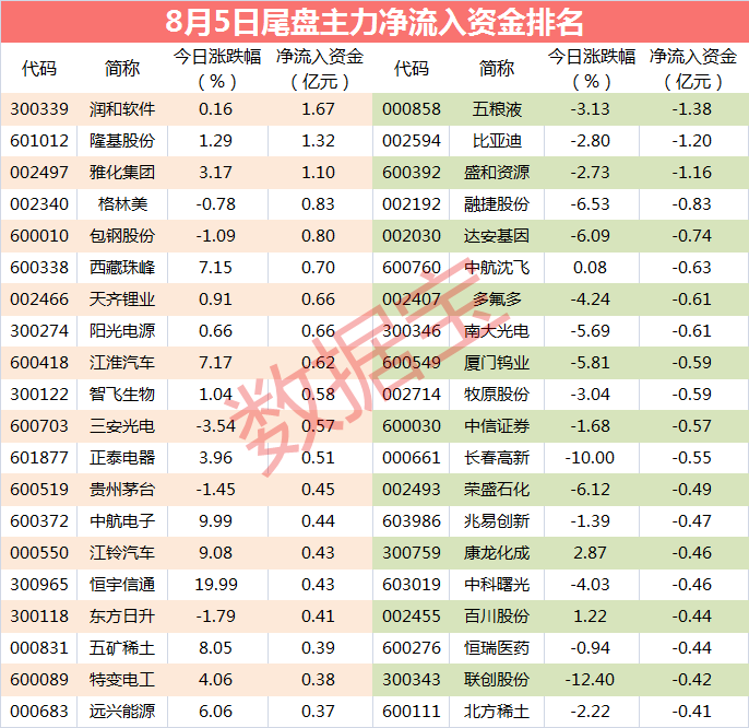 从个股尾盘资金流向数据看,有12股尾盘净流入资金超过5000万元,润和软件、隆基股份和雅化集团等个股尾盘资金净流入金额最多,分别达1.67亿元、1.32亿元、1.1亿元;五粮液、比亚迪和盛和资源等个股尾盘资金净流出金额居前,分别流出1.38亿元、1.2亿元、1.16亿元。