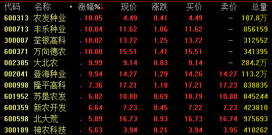 种业股今日盘中大幅走高,截至收盘,农发种业、丰乐种业、荃银高科、万向德农、大北农、登海种业等涨停,隆平高科涨逾7%。