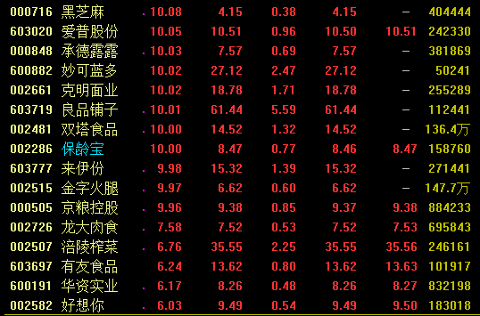 食品板块今日盘中走势活跃,截至收盘,黑芝麻、承德露露、妙可蓝多、克明面业、良品铺子、保龄宝、来伊份、金字火腿等涨停。