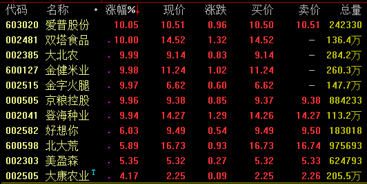 人造肉概念今日盘中再度活跃,截至收盘,龙头股双塔食品两连板,爱普股份、大北农、金健米业、金字火腿、京粮控股、登海种业等均涨停,好想你涨逾6%.